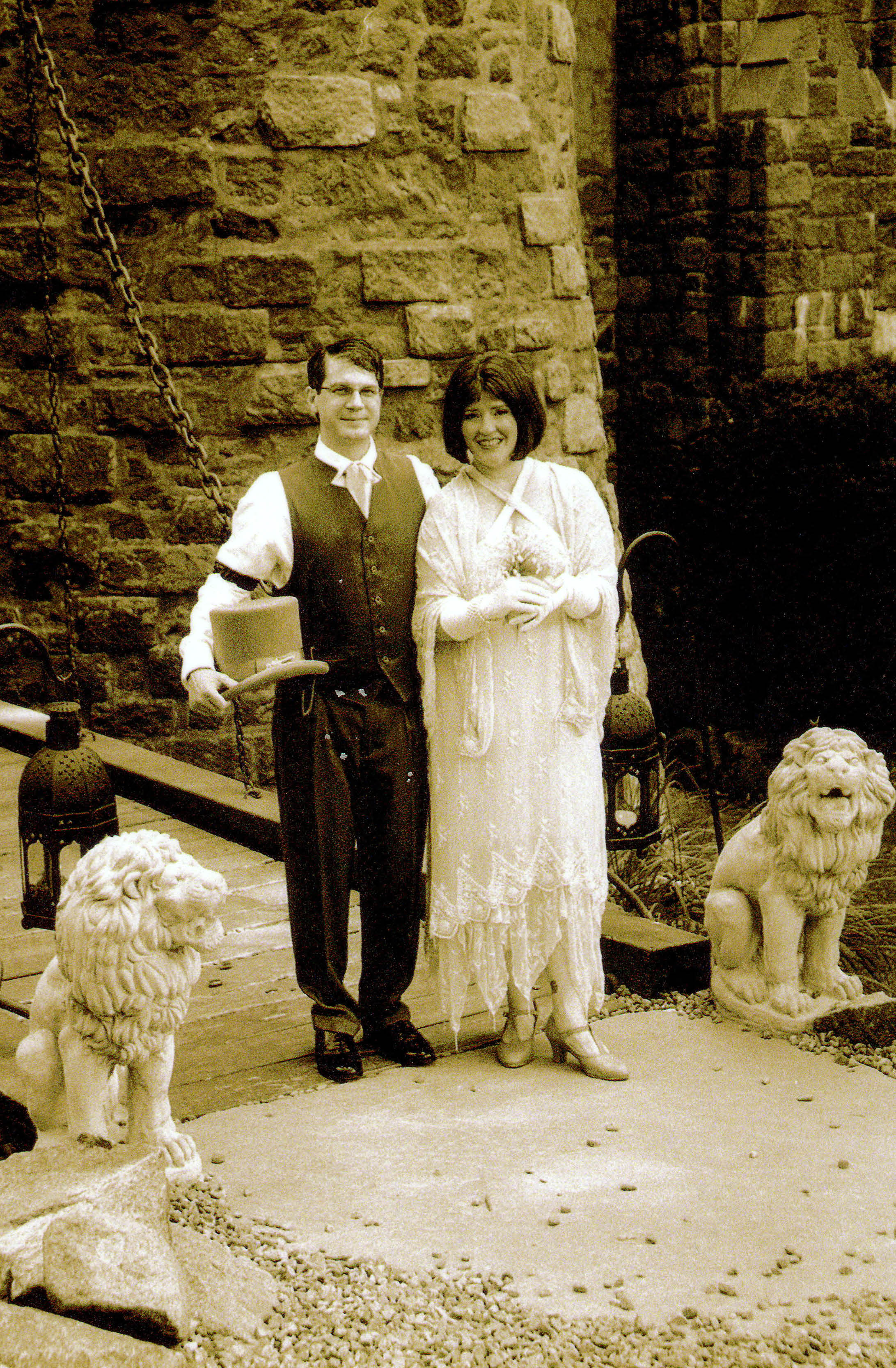 Joe and Ren on the drawbridge in sepia