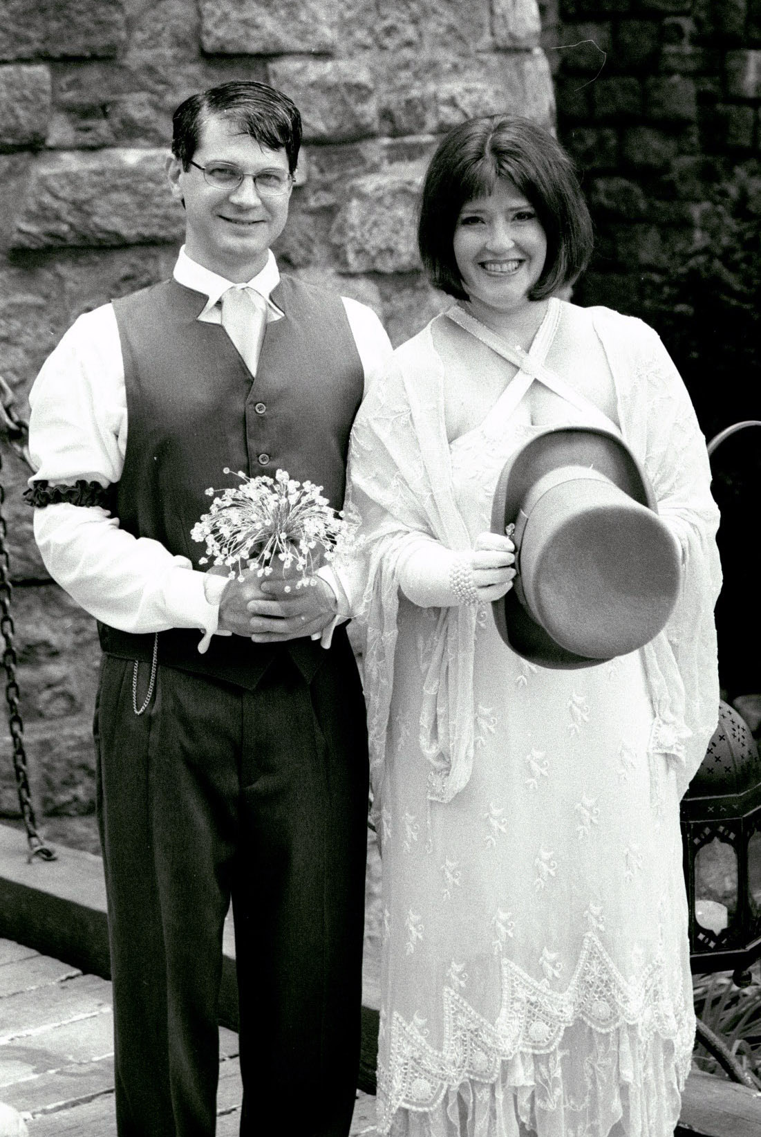 Joe with bouquet and Ren with top hat
